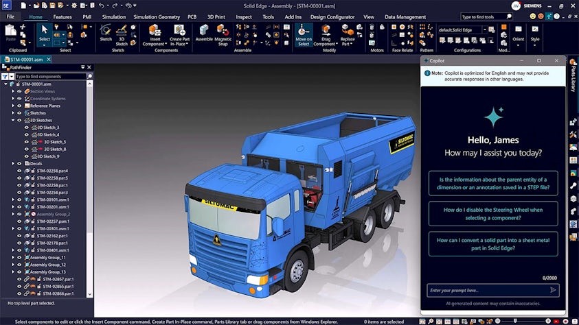 Designcenter Solid Edge 2026은 새로운 AI copilot을 도입함으로써 자연어 입력을 통해 사용자가 도움말 자료를 신속하게 찾을 수 있도록 지원한다. 또한 눈의 피로를 줄이고 시각적 대비를 향상시키는 새로운 다크 테마를 제공한다.