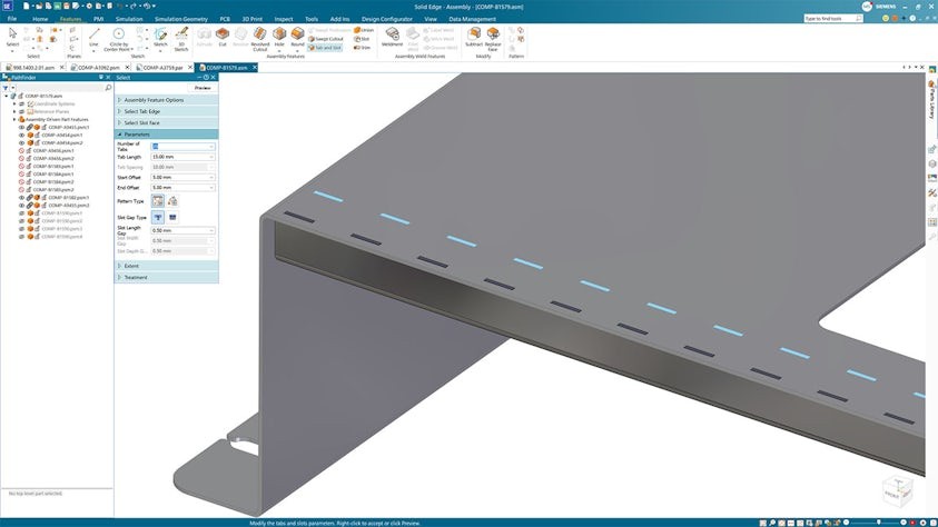 Designcenter Solid Edge 2026의 Tab과 Slot 기능은 판금 부품 간 정밀한 맞물림 연결을 자동으로 생성한다. 이 기능은 용접 또는 어셈블리 시 완벽한 정렬과 자체 고정 기능을 보장함으로써 수동 설정을 줄이고 제조 정밀도를 향상시킨다.